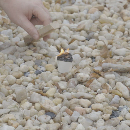• or even throwing a fire starter cup and a few pieces of kindling in a lightweight backpack while hiking or going camping